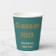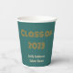 Class of 20xx appears in a large orange font above two lines of grey display text for the graduate's name and school. All text can be edited or deleted. The favour tag has a retro, 70s style colour palette of muted blue-green and orange.