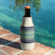 Fun retro/mod navy blue, teal, and green striped bottle/can cooler lets you keep your beverage cool as you enjoy the outdoors.