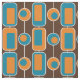 Orange and blue rectangles and circles on a brown background are inspired by retro patterns.