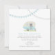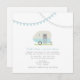 A wedding invitation featuring an illustration of a blue vintage trailer parked in grass. Trailer has a window box filled with daisies and black eyed susans. Blue and grey bunting at top. Personalise the text with details of your occasion. Look for matching items at Jill's Paperie.