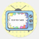 A sticker featuring a light yellow background with small light green polka dots. Retro inspired blue TV set features a test screen and rabbit ear antennae. Personalise with your name or other text of your choice. Look for matching items at Jill's Paperie.