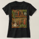 A cozy retro-inspired design featuring a charming bookshelf filled with vintage books, delicate botanical accents, and a comforting cup of tea or coffee.