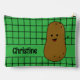 Adorable accessory bag featuring a cute happy cartoon brown potato. The background is a cute retro pattern of a black grid over a solid bold green colour. A template at the bottom and left to the potato to add your name.