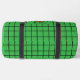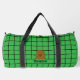 Adorable duffel bag featuring a cute happy cartoon brown potato. The background is a cute retro pattern of a black grid over a solid bold green colour. A template at the bottom of the potato to add your name.