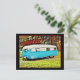 Old time old-time RV. The retro caravan is bright blue and white. It's surrounded with vivid green grass and a small forest is the backdrop. This photo art is pure nostalgia.