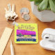 A bright yellow classic retro coach camper with a magenta pink stripe, cruises through a colourful expansive landscape. There are mountains in the background, trees below the rolling hills, and grassland along the road. The campers have plenty of time for their adventure because they are happily retired. The words "RETIRED and camping happily ever after" frame this cheerful artwork. There is also a template for either a name or initials. The design is the same on both the front and back of the keychain.