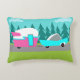 This Retro Camper / Trailer and Car Accent Pillow features a mid century modern, minimalist cartoon drawing that will leave you ready to take to the open road. An homage to the 1950s, this design features a vintage turquoise car with white top, pulling a kitschy travel trailer to its final destination. The perfectly restored, retro RV has a hot pink lower half, white top half, and a turquoise lightning bolt separating the two. The door in the side of the camper is also turquoise. The final accent is the hot pink wing protruding from the back of this home on wheels. The happy campers are motoring down a grey road. The roadway is surrounded by lush, green grass. In the background, we can see the teal silhouettes of a veritable forest of cedar trees, against an aqua sky with puffy, light blue clouds. The opposite side of this throw pillow is a solid aqua, and can be personalised, if you wish. This design is perfect for everyone from retired hippies, fledgling hipsters, or anyone who wants to relive some great childhood memories. The best part is that no one is asking, "Are we there yet?"