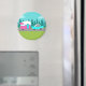 This Retro Camper / Trailer and Car Magnet features a mid century modern, minimalist cartoon drawing that will leave you ready to take to the open road. An homage to the 1950s, this design features a vintage turquoise car with white top, pulling a kitschy travel trailer to its final destination. The perfectly restored, retro RV has a hot pink lower half, white top half, and a turquoise lightning bolt separating the two. The door in the side of the camper is also turquoise. The final accent is the hot pink wing protruding from the back of this home on wheels. The happy campers are motoring down a grey road. The roadway is surrounded by lush, green grass. In the background, we can see the teal silhouettes of a veritable forest of cedar trees, against an aqua sky with puffy, light blue clouds. This design is perfect for everyone from retired hippies, fledgling hipsters, or anyone who wants to relive some great childhood memories. The best part is that no one is asking, "Are we there yet?"