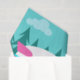 This Retro Camper / Trailer and Car Tissue Paper features a mid century modern, minimalist cartoon drawing that will leave you ready to take to the open road. An homage to the 1950s, this design features a vintage turquoise car with white top, pulling a kitschy travel trailer to its final destination. The perfectly restored, retro RV has a hot pink lower half, white top half, and a turquoise lightning bolt separating the two. The door in the side of the camper is also turquoise. The final accent is the hot pink wing protruding from the back of this home on wheels. The happy campers are motoring down a grey road. The roadway is surrounded by lush, green grass. In the background, we can see the teal silhouettes of a veritable forest of cedar trees, against an aqua sky with puffy, light blue clouds. This design is perfect for everyone from retired hippies, fledgling hipsters, or anyone who wants to relive some great childhood memories. The best part is that no one is asking, "Are we there yet?"