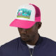 This Retro Camper / Trailer and Car Trucker Hat features a mid century modern, minimalist cartoon drawing that will leave you ready to take to the open road. An homage to the 1950s, this design features a vintage turquoise car with white top, pulling a kitschy travel trailer to its final destination. The perfectly restored, retro RV has a hot pink lower half, white top half, and a turquoise lightning bolt separating the two. The door in the side of the camper is also turquoise. The final accent is the hot pink wing protruding from the back of this home on wheels. The happy campers are motoring down a grey road. The roadway is surrounded by lush, green grass. In the background, we can see the teal silhouettes of a veritable forest of cedar trees, against an aqua sky with puffy, light blue clouds. This design is perfect for everyone from retired hippies, fledgling hipsters, or anyone who wants to relive some great childhood memories. The best part is that no one is asking, "Are we there yet?"