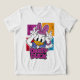 The exhilarating and whimsical drawing contains an adorable cartoon duck dynamically posed, giving a peace sign with a smiling and confident demeanor—topped off with a fashionable purple bow and sporty light blue shirt to give her extra character and charm. Underneath are bold, stylized letters in a striking magenta-purple; added to that, enhancing its retro feel. The background shows a colorful square grid in purple, orange, and teal, resembling those old comic book panels. Bold outlines, brilliant colors, and a uniquely classic-yet-modern vibe make this one a winner for any cartoon lover and aficionados of classic animation style.