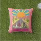 Throw pillow in an illustration of five stylishly dressed cats wearing sunglasses ride in a pink convertible through a vibrant desert landscape. The backdrop features cacti, mountains, and a radiant, setting sun. The whimsical, pop-art style evokes a playful, retro road trip vibe.