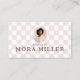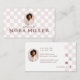 Turn heads with this chic light pink checkerboard design, featuring a stylish retro circle photo frame—perfect for showcasing your face or logo. Personalize with your name, professional title, and specialty to instantly convey your expertise. The reverse side mirrors the elegant checkerboard pattern and provides space for social media icons, contact details—making it easy for clients to reach you. Fully customizable to match your brand colors and style, this business card combines vintage charm with modern sophistication. Whether you’re an esthetician, skincare specialist, makeup artist, or beauty professional, this card is a standout way to present your brand with confidence and style. Design and layout by © Moodthology