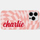 Phone case featuring a light blush pink, twisted chequerboard pattern and your name in a red, retro style font.