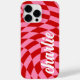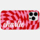 Phone case featuring a pink and red, twisted chequerboard pattern and your name in a white, retro style font.