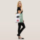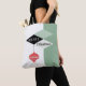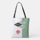 A stylish retro chic tote bag for the Christmas holiday season in a mid-century modern design that has geometric diamond shapes with Merry Christmas text. A vintage Christmas ornament in bright coral red hangs from the diamond shaped pattern. The background includes a colour block design of sage green and white. Spread holiday cheer at the mall, the supermarket, at work or school, and everywhere you go during the holiday season.