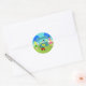 When life hands you lemons, it's time to buy these Retro Children's Lemonade Stand Stickers. This nostalgic, 1960's style, minimalist art design features a wonderfully kitschy side of suburbia, where picket fences are plentiful and children are budding business entrepreneurs. The scene looks like it's straight out of a classic television show, with a young girl learning the value of a dollar while operating her vintage lemonade stand. The girl is wearing a blue dress, with a light blue pinafore. Her dark hair is pulled back in a bouncy ponytail. The stand itself was masterfully crafted by a master craftsman. It is painted in shades of teal, with a giant, yellow lemon proudly proclaiming the bargain price of $0.25! On the counter, there is a full pitcher of tangy, liquid refreshment. Our business girl is enjoying the fruits of her mother's labour, by sipping on a tall glass of lemonade. To the side, Mum is approaching, carrying another pitcher of freshly squeezed lemonade. She is wearing a bright, pink dress, with a yellow apron tied around her waist. It looks as if business is booming for the Princess of Lemonade. She appears to have made an easy sale to her father. Cha-ching! Standing on the lush green lawn, Dad is wearing green shorts and a yellow shirt that matches his wife's sunny disposition. He is standing behind a red lawnmower. We can see that he has already mowed a strip of grass, but, at this point, it's difficult to tell if he is working hard or hardly working. The mowing seems to be at a standstill while he enjoys a tangy glass of lemonade. Ah, refreshing! In the background, we can see mod, cartoon trees in shades of blue. They are perfectly backdropped by a sky in the shade of aqua reserved for Hometown, USA, in mid century modern artwork.