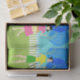 When life hands you lemons, it's time to buy this Retro Children's Lemonade Stand Tissue Paper. This nostalgic, 1960's style, minimalist art design features a wonderfully kitschy side of suburbia, where picket fences are plentiful and children are budding business entrepreneurs. The scene looks like it's straight out of a classic television show, with a young girl learning the value of a dollar while operating her vintage lemonade stand. The girl is wearing a blue dress, with a light blue pinafore. Her dark hair is pulled back in a bouncy ponytail. The stand itself was masterfully crafted by a master craftsman. It is painted in shades of teal, with a giant, yellow lemon proudly proclaiming the bargain price of $0.25! On the counter, there is a full pitcher of tangy, liquid refreshment. Our business girl is enjoying the fruits of her mother's labour, by sipping on a tall glass of lemonade. To the side, Mum is approaching, carrying another pitcher of freshly squeezed lemonade. She is wearing a bright, pink dress, with a yellow apron tied around her waist. It looks as if business is booming for the Princess of Lemonade. She appears to have made an easy sale to her father. Cha-ching! Standing on the lush green lawn, Dad is wearing green shorts and a yellow shirt that matches his wife's sunny disposition. He is standing behind a red lawnmower. We can see that he has already mowed a strip of grass, but, at this point, it's difficult to tell if he is working hard or hardly working. The mowing seems to be at a standstill while he enjoys a tangy glass of lemonade. Ah, refreshing! In the background, we can see mod, cartoon trees in shades of blue. They are perfectly backdropped by a sky in the shade of aqua reserved for Hometown, USA, in mid century modern artwork.