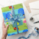 When life hands you lemons, it's time to buy this Retro Children's Lemonade Stand Wrapping Paper. This nostalgic, 1960's style, minimalist art design features a wonderfully kitschy side of suburbia, where picket fences are plentiful and children are budding business entrepreneurs. The scene looks like it's straight out of a classic television show, with a young girl learning the value of a dollar while operating her vintage lemonade stand. The girl is wearing a blue dress, with a light blue pinafore. Her dark hair is pulled back in a bouncy ponytail. The stand itself was masterfully crafted by a master craftsman. It is painted in shades of teal, with a giant, yellow lemon proudly proclaiming the bargain price of $0.25! On the counter, there is a full pitcher of tangy, liquid refreshment. Our business girl is enjoying the fruits of her mother's labour, by sipping on a tall glass of lemonade. To the side, Mum is approaching, carrying another pitcher of freshly squeezed lemonade. She is wearing a bright, pink dress, with a yellow apron tied around her waist. It looks as if business is booming for the Princess of Lemonade. She appears to have made an easy sale to her father. Cha-ching! Standing on the lush green lawn, Dad is wearing green shorts and a yellow shirt that matches his wife's sunny disposition. He is standing behind a red lawnmower. We can see that he has already mowed a strip of grass, but, at this point, it's difficult to tell if he is working hard or hardly working. The mowing seems to be at a standstill while he enjoys a tangy glass of lemonade. Ah, refreshing! In the background, we can see mod, cartoon trees in shades of blue. They are perfectly backdropped by a sky in the shade of aqua reserved for Hometown, USA, in mid century modern artwork.