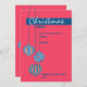 Three orange and blue retro style Christmas ornaments, slightly offset against a bright red background, a sweet, different look for Christmas celebrations.