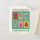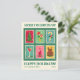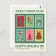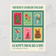 This Christmas Holiday Card features retro Christmas stamps with lollipops, a Christmas tree, candy cane, wine, and reindeer cake images, and retro typography text "Merry Christmas" and "Happy Holidays". Personalise it with your name and year.