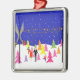 This Retro Christmas Tree Farm Holiday Ornament features a mid century modern, minimalist, cartoon family in search of the perfect tree for trimming. The design shows Mum, Dad and Junior in a colourful, 1960s style, Christmas tree lot that looks like it belongs in a televised holiday special. They were beckoned there by the glowing, yellow spotlights illuminating the evening sky and the strands of colourful Christmas lights, which are strung from pole to pole. The snow covered lot offers trees of the cartoon variety. Don't expect to find a blue spruce here. But, if the family is wanting a pink, purple, yellow, orange or red tree, they are in luck! Hey, there are even a couple of green cedars, if they choose to go a more traditional route. The snow is continuing to fall on the merry family decked out in their holiday attire. Junior is wearing blue dungarees and a shirt that is redder than a certain reindeer's nose. Dad is wearing a black suit with a bright green tie. But it is Mum who puts the jolly is this family's wardrobe. She is wearing a red dress with green trim and a matching Santa hat. Mum and Dad are still conferring, unaware that Junior is making a mad dash to the hot pink tree of his dreams. Check every side, Junior! It wouldn't do to purchase a tree with bald spots. Wouldn't you just know it? The tree is as perfect as this design. In fact, if this design were any more perfect, you would hear a choir of children singing in the background.
