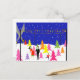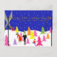 This Retro Christmas Tree Farm Postcard features a mid century modern, minimalist, cartoon family in search of the perfect tree for trimming. The design shows Mum, Dad and Junior in a colourful, 1960s style, Christmas tree lot that looks like it belongs in a televised holiday special. They were beckoned there by the glowing, yellow spotlights illuminating the evening sky and the strands of colourful Christmas lights, which are strung from pole to pole. The snow covered lot offers trees of the cartoon variety. Don't expect to find a blue spruce here. But, if the family is wanting a pink, purple, yellow, orange or red tree, they are in luck! Hey, there are even a couple of green cedars, if they choose to go a more traditional route. The snow is continuing to fall on the merry family decked out in their holiday attire. Junior is wearing blue dungarees and a shirt that is redder than a certain reindeer's nose. Dad is wearing a black suit with a bright green tie. But it is Mum who puts the jolly is this family's wardrobe. She is wearing a red dress with green trim and a matching Santa hat. Mum and Dad are still conferring, unaware that Junior is making a mad dash to the hot pink tree of his dreams. Check every side, Junior! It wouldn't do to purchase a tree with bald spots. Wouldn't you just know it? The tree is as perfect as this design. In fact, if this design were any more perfect, you would hear a choir of children singing in the background.
