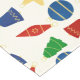 Set a sophisticated and charming holiday table with this gorgeous table runner. It features a festive, all-over pattern of vintage Christmas baubles and bells in classic red, blue, green, and yellow. The design is beautifully highlighted against a soft, light beige background, giving it an elegant, antique feel.