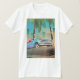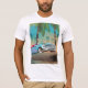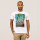 Retro Sea-foam green Automobile with a cityscape and palms.