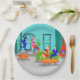 This Retro Classic Television Paper Plate takes you back to a simpler time. The 1960's style, minimalist, cartoon drawing will have you looking for the opening credits. The design shows a mid century modern, sunken, living room with teal and turquoise walls and a red, cone shaped fireplace, complete with a roaring fire. All eyes are on the lanky, man of the house as he makes his grand entrance. The handsome Mister is wearing a blue suit and orange tie. His lovely Mrs. and energetic, young son are rushing to greet him. The lady of the house is wearing a hot pink, sheath dress, which she fills out in all the right places. The flip in her dark hair is sheer perfection. Junior is wearing a red shirt and blue jeans for his dash to see if his father has brought him anything. Whoa! Don't knock over the potted plant, Junior! On the lower level, we can see a green couch and an orange coffee table. Wait! We appear to have guests! Seated on the couch are a dark haired man in a blue suit and red tie, alongside a shapely blonde woman in a red dress with a red bow in her hair. Hey! It's Dad's coworkers. How did they get there first? It's one of the eternal mysteries of television. It looks like we're all set for a great evening in sitcom suburbia. But, first, we have to see if Dad is going to trip over the orange ottoman or sidestep it with some fancy footwork. Oh, the zaniness! The only thing missing from this scene is the theme song. And, if you listen closely, you can probably hear it in your mind.