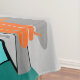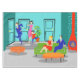 This Retro Classic Television Tablecloth takes you back to a simpler time. The 1960's style, minimalist, cartoon drawing will have you looking for the opening credits. The design shows a mid century modern, sunken, living room with teal and turquoise walls and a red, cone shaped fireplace, complete with a roaring fire. All eyes are on the lanky, man of the house as he makes his grand entrance. The handsome Mister is wearing a blue suit and orange tie. His lovely Mrs. and energetic, young son are rushing to greet him. The lady of the house is wearing a hot pink, sheath dress, which she fills out in all the right places. The flip in her dark hair is sheer perfection. Junior is wearing a red shirt and blue jeans for his dash to see if his father has brought him anything. Whoa! Don't knock over the potted plant, Junior! On the lower level, we can see a green couch and an orange coffee table. Wait! We appear to have guests! Seated on the couch are a dark haired man in a blue suit and red tie, alongside a shapely blond woman in a red dress with a red bow in her hair. Hey! It's Dad's coworkers. How did they get there first? It's one of the eternal mysteries of television. It looks like we're all set for a great evening in sitcom suburbia. But, first, we have to see if Dad is going to trip over the orange ottoman or sidestep it with some fancy footwork. Oh, the zaniness! The only thing missing from this scene is the theme song. And, if you listen closely, you can probably hear it in your mind.