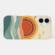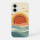 Stylized sun above calm waves with minimalist clouds in a vintage style.