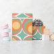 This wrapping paper has a mid-century modern design of concentric circles in 1970s colors with stars between each group.