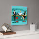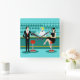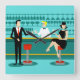 Every hour is happy hour with this Retro Cocktail Lounge Acrylic Wall Clock. The mid century modern design features a vibrant, 1960's style, minimalist, cartoon drawing of a classy, cocktail bar. Against the backdrop of an aqua wall, we can see rows of drink glasses. At least we can see the teal silhouettes of drink glasses. Judging from the shapes of the stemware, this bar is well equipped to wet your whistle, whatever your drink preference. A most competent and personable bartender is manning the teal bar with yellow accents. The young barkeep is wearing a pristine, white shirt with black bow tie. His fresh-faced good looks, blonde hair and black hipster glasses give us every reason to believe that he either spends his days as a struggling actor or a superhero. In one hand, the handsome mixologist is handing a martini to a customer on the opposite side of the bar. The waiting customer is a broad-shouldered gentleman in a black suit and red tie. He's the sort of fellow who is described as tall, dark, and handsome even when it's still hours until closing time. There seems to be a red and chrome bar stool with Mr. Debonair's name on it. Yet, not to be presumptuous, he asks the question, "Pardon me. Is this seat taken?" He is asking the raven haired gal on the neighbouring bar stool. She's a real "girl next door" type, if you happen to live next door to a flawless beauty with a figure that won't quit. She is wearing a black dress and holding a martini in one hand. She's hoping that she and the approaching gentleman have more in common that their drink preference and choice of wardrobe colour. It looks like this evening just got interesting. Cheers to you!