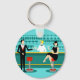 Every hour is happy hour with this Retro Cocktail Lounge Button Keychain. The mid century modern design features a vibrant, 1960's style, minimalist, cartoon drawing of a classy, cocktail bar. Against the backdrop of an aqua wall, we can see rows of drink glasses. At least we can see the teal silhouettes of drink glasses. Judging from the shapes of the stemware, this bar is well equipped to wet your whistle, whatever your drink preference. A most competent and personable bartender is manning the teal bar with yellow accents. The young barkeep is wearing a pristine, white shirt with black bow tie. His fresh-faced good looks, blonde hair and black hipster glasses give us every reason to believe that he either spends his days as a struggling actor or a superhero. In one hand, the handsome mixologist is handing a martini to a customer on the opposite side of the bar. The waiting customer is a broad-shouldered gentleman in a black suit and red tie. He's the sort of fellow who is described as tall, dark, and handsome even when it's still hours until closing time. There seems to be a red and chrome bar stool with Mr. Debonair's name on it. Yet, not to be presumptuous, he asks the question, "Pardon me. Is this seat taken?" He is asking the raven haired gal on the neighbouring bar stool. She's a real "girl next door" type, if you happen to live next door to a flawless beauty with a figure that won't quit. She is wearing a black dress and holding a martini in one hand. She's hoping that she and the approaching gentleman have more in common that their drink preference and choice of wardrobe colour. It looks like this evening just got interesting. Cheers to you!