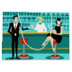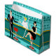 Every hour is happy hour with this Retro Cocktail Lounge Gift Bag. The mid century modern design features a vibrant, 1960's style, minimalist, cartoon drawing of a classy, cocktail bar. Against the backdrop of an aqua wall, we can see rows of drink glasses. At least we can see the teal silhouettes of drink glasses. Judging from the shapes of the stemware, this bar is well equipped to wet your whistle, whatever your drink preference. A most competent and personable bartender is manning the teal bar with yellow accents. The young barkeep is wearing a pristine, white shirt with black bow tie. His fresh-faced good looks, blonde hair and black hipster glasses give us every reason to believe that he either spends his days as a struggling actor or a superhero. In one hand, the handsome mixologist is handing a martini to a customer on the opposite side of the bar. The waiting customer is a broad-shouldered gentleman in a black suit and red tie. He's the sort of fellow who is described as tall, dark, and handsome even when it's still hours until closing time. There seems to be a red and chrome bar stool with Mr. Debonair's name on it. Yet, not to be presumptuous, he asks the question, "Pardon me. Is this seat taken?" He is asking the raven haired gal on the neighbouring bar stool. She's a real "girl next door" type, if you happen to live next door to a flawless beauty with a figure that won't quit. She is wearing a black dress and holding a martini in one hand. She's hoping that she and the approaching gentleman have more in common that their drink preference and choice of wardrobe colour. It looks like this evening just got interesting. Cheers to you!