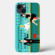 Every hour is happy hour with this Retro Cocktail Lounge iPhone 6 Case. The mid century modern design features a vibrant, 1960's style, minimalist, cartoon drawing of a classy, cocktail bar. Against the backdrop of an aqua wall, we can see rows of drink glasses. At least we can see the teal silhouettes of drink glasses. Judging from the shapes of the stemware, this bar is well equipped to wet your whistle, whatever your drink preference. A most competent and personable bartender is manning the teal bar with yellow accents. The young barkeep is wearing a pristine, white shirt with black bow tie. His fresh-faced good looks, blonde hair and black hipster glasses give us every reason to believe that he either spends his days as a struggling actor or a superhero. In one hand, the handsome mixologist is handing a martini to a customer on the opposite side of the bar. The waiting customer is a broad-shouldered gentleman in a black suit and red tie. He's the sort of fellow who is described as tall, dark, and handsome even when it's still hours until closing time. There seems to be a red and chrome bar stool with Mr. Debonair's name on it. Yet, not to be presumptuous, he asks the question, "Pardon me. Is this seat taken?" He is asking the raven haired gal on the neighbouring bar stool. She's a real "girl next door" type, if you happen to live next door to a flawless beauty with a figure that won't quit. She is wearing a black dress and holding a martini in one hand. She's hoping that she and the approaching gentleman have more in common that their drink preference and choice of wardrobe colour. It looks like this evening just got interesting. Cheers to you!