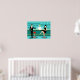 Every hour is happy hour with this Retro Cocktail Lounge Poster. The mid century modern design features a vibrant, 1960's style, minimalist, cartoon drawing of a classy, cocktail bar. Against the backdrop of an aqua wall, we can see rows of drink glasses. At least we can see the teal silhouettes of drink glasses. Judging from the shapes of the stemware, this bar is well equipped to wet your whistle, whatever your drink preference. A most competent and personable bartender is manning the teal bar with yellow accents. The young barkeep is wearing a pristine, white shirt with black bow tie. His fresh-faced good looks, blonde hair and black hipster glasses give us every reason to believe that he either spends his days as a struggling actor or a superhero. In one hand, the handsome mixologist is handing a martini to a customer on the opposite side of the bar. The waiting customer is a broad-shouldered gentleman in a black suit and red tie. He's the sort of fellow who is described as tall, dark, and handsome even when it's still hours until closing time. There seems to be a red and chrome bar stool with Mr. Debonair's name on it. Yet, not to be presumptuous, he asks the question, "Pardon me. Is this seat taken?" He is asking the raven haired gal on the neighbouring bar stool. She's a real "girl next door" type, if you happen to live next door to a flawless beauty with a figure that won't quit. She is wearing a black dress and holding a martini in one hand. She's hoping that she and the approaching gentleman have more in common that their drink preference and choice of wardrobe colour. It looks like this evening just got interesting. Cheers to you!
