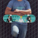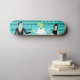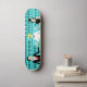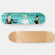 Every hour is happy hour with this Retro Cocktail Lounge Skateboard. The mid century modern design features a vibrant, 1960's style, minimalist, cartoon drawing of a classy, cocktail bar. Against the backdrop of an aqua wall, we can see rows of drink glasses. At least we can see the teal silhouettes of drink glasses. Judging from the shapes of the stemware, this bar is well equipped to wet your whistle, whatever your drink preference. A most competent and personable bartender is manning the teal bar with yellow accents. The young barkeep is wearing a pristine, white shirt with black bow tie. His fresh-faced good looks, blonde hair and black hipster glasses give us every reason to believe that he either spends his days as a struggling actor or a superhero. In one hand, the handsome mixologist is handing a martini to a customer on the opposite side of the bar. The waiting customer is a broad-shouldered gentleman in a black suit and red tie. He's the sort of fellow who is described as tall, dark, and handsome even when it's still hours until closing time. There seems to be a red and chrome bar stool with Mr. Debonair's name on it. Yet, not to be presumptuous, he asks the question, "Pardon me. Is this seat taken?" He is asking the raven haired gal on the neighbouring bar stool. She's a real "girl next door" type, if you happen to live next door to a flawless beauty with a figure that won't quit. She is wearing a black dress and holding a martini in one hand. She's hoping that she and the approaching gentleman have more in common that their drink preference and choice of wardrobe colour. It looks like this evening just got interesting. Cheers to you!