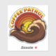 Coffee Patrol. Surfer with a cup of coffee riding a coffee wave with a sunset in the background. Retro 70s distressed style.
