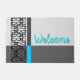 Mid Century Modern shapes on a colour blocked background in blues and greys