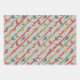 Retro inspired holiday gift wrap features colourful winter birds pattern overlay on thin Christmas green and red stripes. The design is presented on three different coloured backgrounds