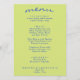 A colourful retro funky modern bright wedding dinner menu. Which features chic template design of boho vintage pale green background and blue typography and hand written menu in blue . And bright back green background. Perfect and matching with the whole suite.