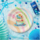 Whimsical floral birthday cake in blue, orange and pink with a retro orange, pink and purple background. Add a name in the personalise area.
