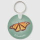 This simply designed Monarch butterfly keychain features a single Monarch butterfly with characteristic darker to lighter orange/yellow markings in a digitally distressed style on a customisable retro teal background - by katz_d_zynes