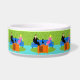 This Retro Couple with Cat Ceramic Pet Bowl features a cartoon couple trying to get cosy while watching television on a mid century modern, blue sofa. The cat, however, has other ideas. On one side of the sofa, there is a handsome man in a black suit with red tie. On the other side of the stylish couch, there is a beautiful, blonde woman in a form fitting, hot pink dress. Things would be going great if it weren't for the sleek black cat, which has laid claim to the centre sofa cushion. This 1960's style, minimalist art design is set in a stylish living room. The sofa's backdrop is a green, stone wall. On the aqua floor, there is a round, green shag rug, which matches the stone wall. At the forefront of the design, we see the back of an orange television set with rabbit ears, which seems to be playing the cat's favourite TV program.
