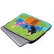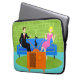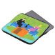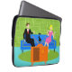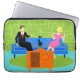 This Retro Couple with Cat Laptop Sleeve features a cartoon couple trying to get cosy while watching television on a mid century modern, blue sofa. The cat, however, has other ideas. On one side of the sofa, there is a handsome man in a black suit with red tie. On the other side of the stylish couch, there is a beautiful, blonde woman in a form fitting, hot pink dress. Things would be going great if it weren't for the sleek black cat, which has laid claim to the centre sofa cushion. This 1960's style, minimalist art design is set in a stylish living room. The sofa's backdrop is a green, stone wall. On the aqua floor, there is a round, green shag rug, which matches the stone wall. At the forefront of the design, we see the back of an orange television set with rabbit ears, which seems to be playing the cat's favourite TV program.
