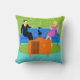 This Retro Couple with Cat Throw Pillow features a cartoon couple trying to get cosy while watching television on a mid century modern, blue sofa. The cat, however, has other ideas. On one side of the sofa, there is a handsome man in a black suit with red tie. On the other side of the stylish couch, there is a beautiful, blonde woman in a form fitting, hot pink dress. Things would be going great if it weren't for the sleek black cat, which has laid claim to the centre sofa cushion. This 1960's style, minimalist art design is set in a stylish living room. The sofa's backdrop is a green, stone wall. On the aqua floor, there is a round, green shag rug, which matches the stone wall. At the forefront of the design, we see the back of an orange television set with rabbit ears, which seems to be playing the cat's favourite TV program. The opposite side of this fun throw pillow has a green, stone pattern.