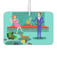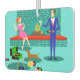 This Retro Couple with Dog Air Freshener looks like a scene out of a romantic comedy. The 1960s's style, minimalist art design features an attractive couple enjoying a romantic evening at home. The sophisticated room prominently features an aqua and teal brick fireplace with a bright red ledge. A beautiful, redhead woman wearing a bright, pink dress is perched on the ledge. She is enjoying a martini with a floating olive, a roaring fire, good music, and the company a tall, dark and handsome man. The man is wearing a blue suit and red tie. His martini glass is raised to toast his charming companion. In his other hand, he is holding a vinyl record album. At his feet, we see a most adorable dachshund wearing a red collar. The playful wiener dog is walking in the direction of a green record player with orange, spindle legs. On the floor, there is a colourful group of fun, eclectic, vinyl records. Cheers! Here's to the perfect evening at home.
