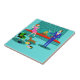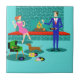 This Retro Couple with Dog Ceramic Tile looks like a scene out of a romantic comedy. The 1960s's style, minimalist art design features an attractive couple enjoying a romantic evening at home. The sophisticated room prominently features an aqua and teal brick fireplace with a bright red ledge. A beautiful, redhead woman wearing a bright, pink dress is perched on the ledge. She is enjoying a martini with a floating olive, a roaring fire, good music, and the company a tall, dark and handsome man. The man is wearing a blue suit and red tie. His martini glass is raised to toast his charming companion. In his other hand, he is holding a vinyl record album. At his feet, we see a most adorable dachshund wearing a red collar. The playful wiener dog is walking in the direction of a green record player with orange, spindle legs. On the floor, there is a colourful group of fun, eclectic, vinyl records. Cheers! Here's to the perfect evening at home.
